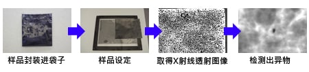 通过高分辨率2维传感器的开发成功、实现了高分辨率的X射线透射图像。仅需数分即可检测出250×200 mm全面的20 μm级金属异物。