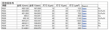 EA8000将从X射线透射图像中检测出的异物尺寸及所在位置列表化。另外,异物尺寸及个数分布利用柱状图表示,实现异物个数及尺寸等的趋势管理。通过荧光X射线分析,异物的元素信息也可自动生成。